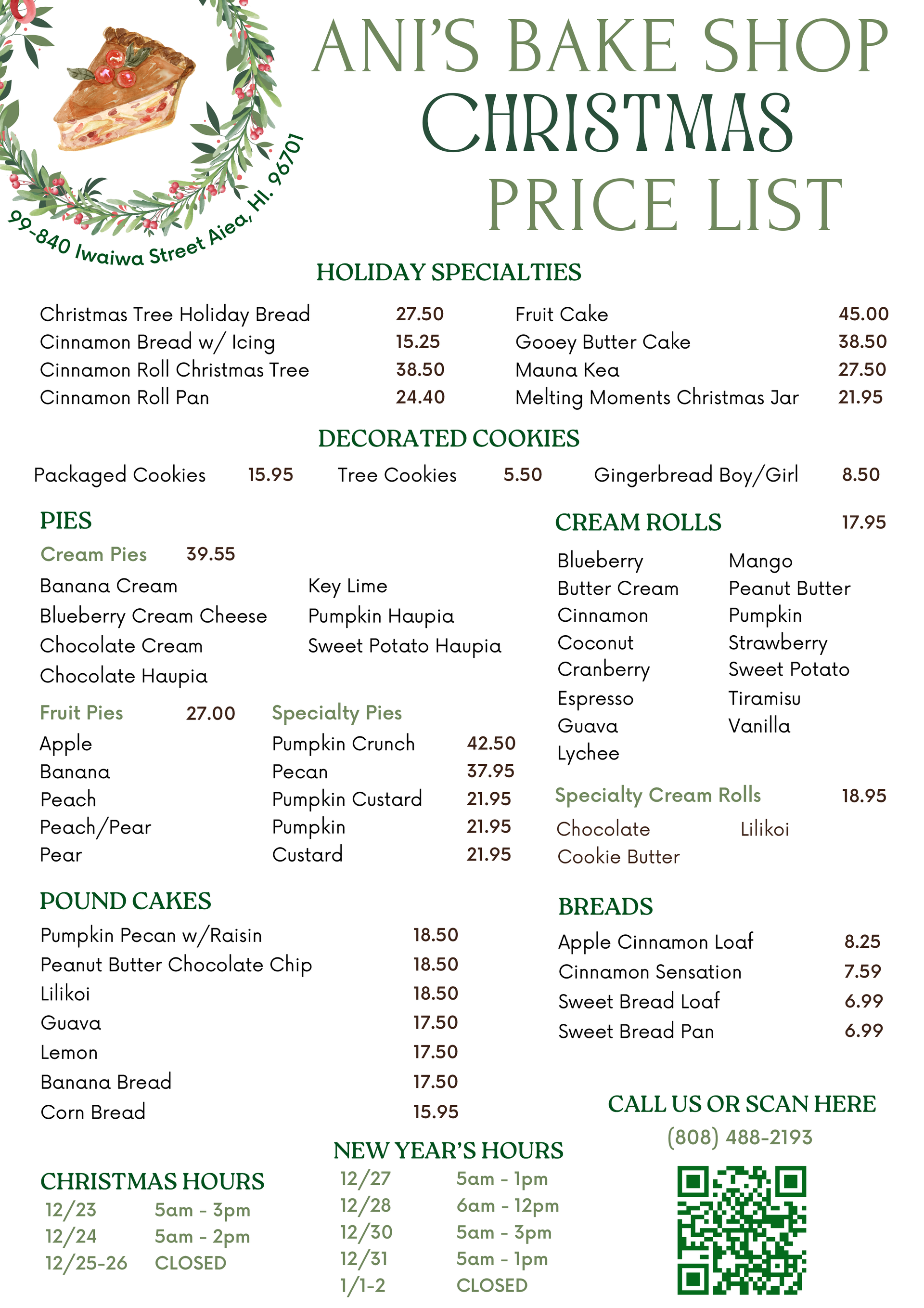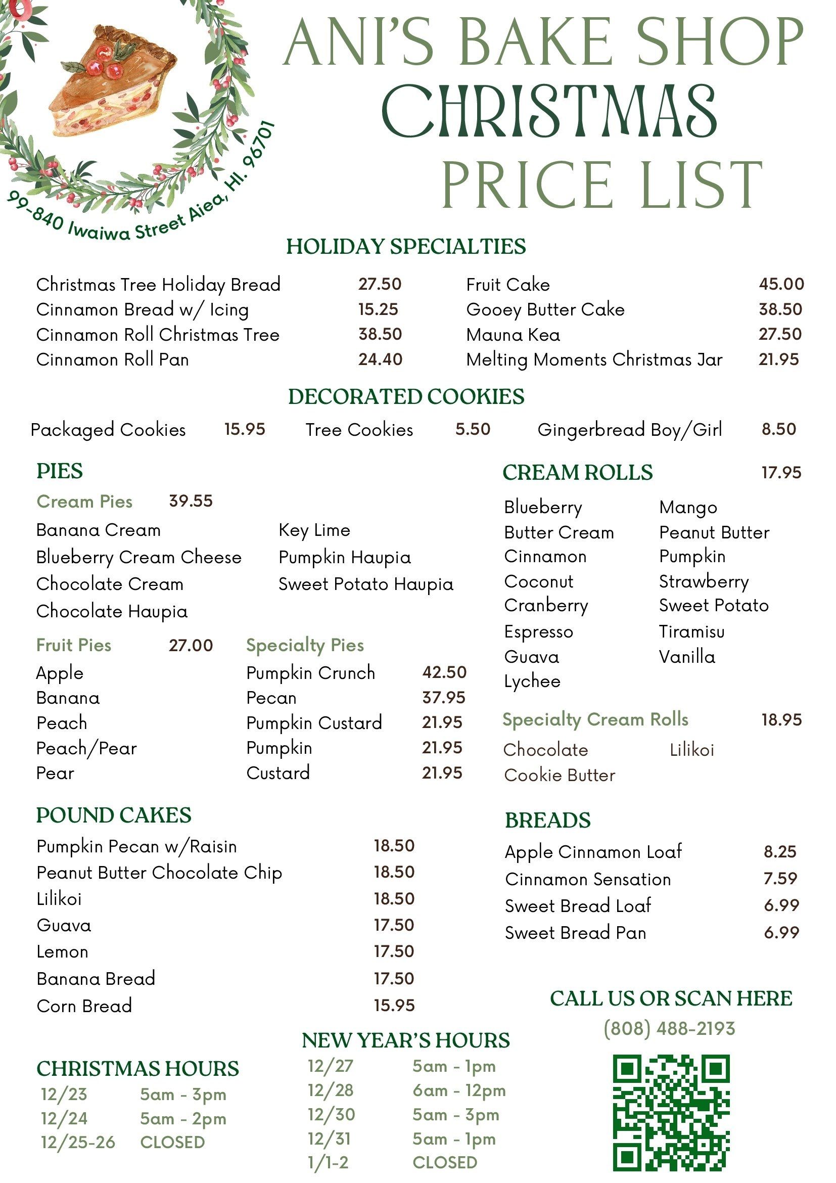 What began as a love of food and a passion for creativity has turned into over 34 years of food excellence. Ani’s Bake Shop in Aiea, HI, and near Halawa Valley is your home for handmade sweet bread, cream rolls, pastries, pies, pound cakes, and a whole lot more. Stop by today to treat yourself to our delicious treats!